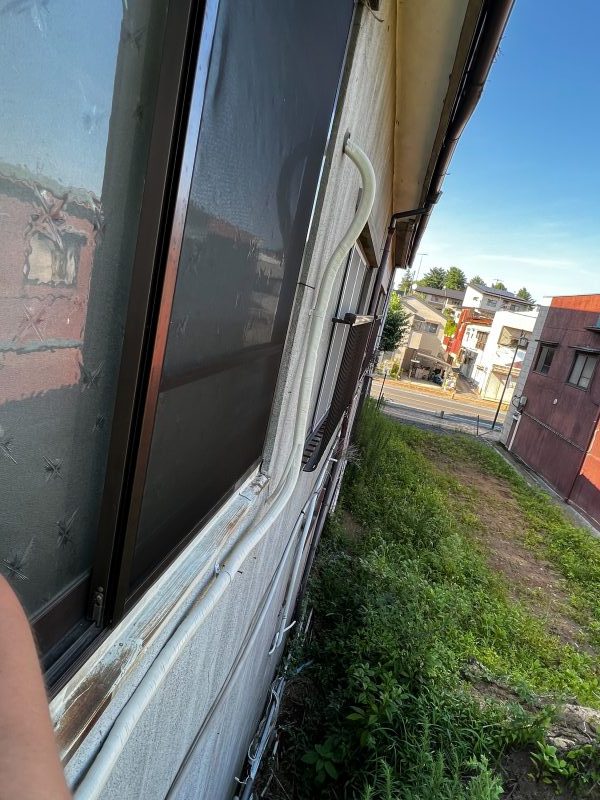 室外機を真下に置けない為家をぐるりと回り屋根おきにしました